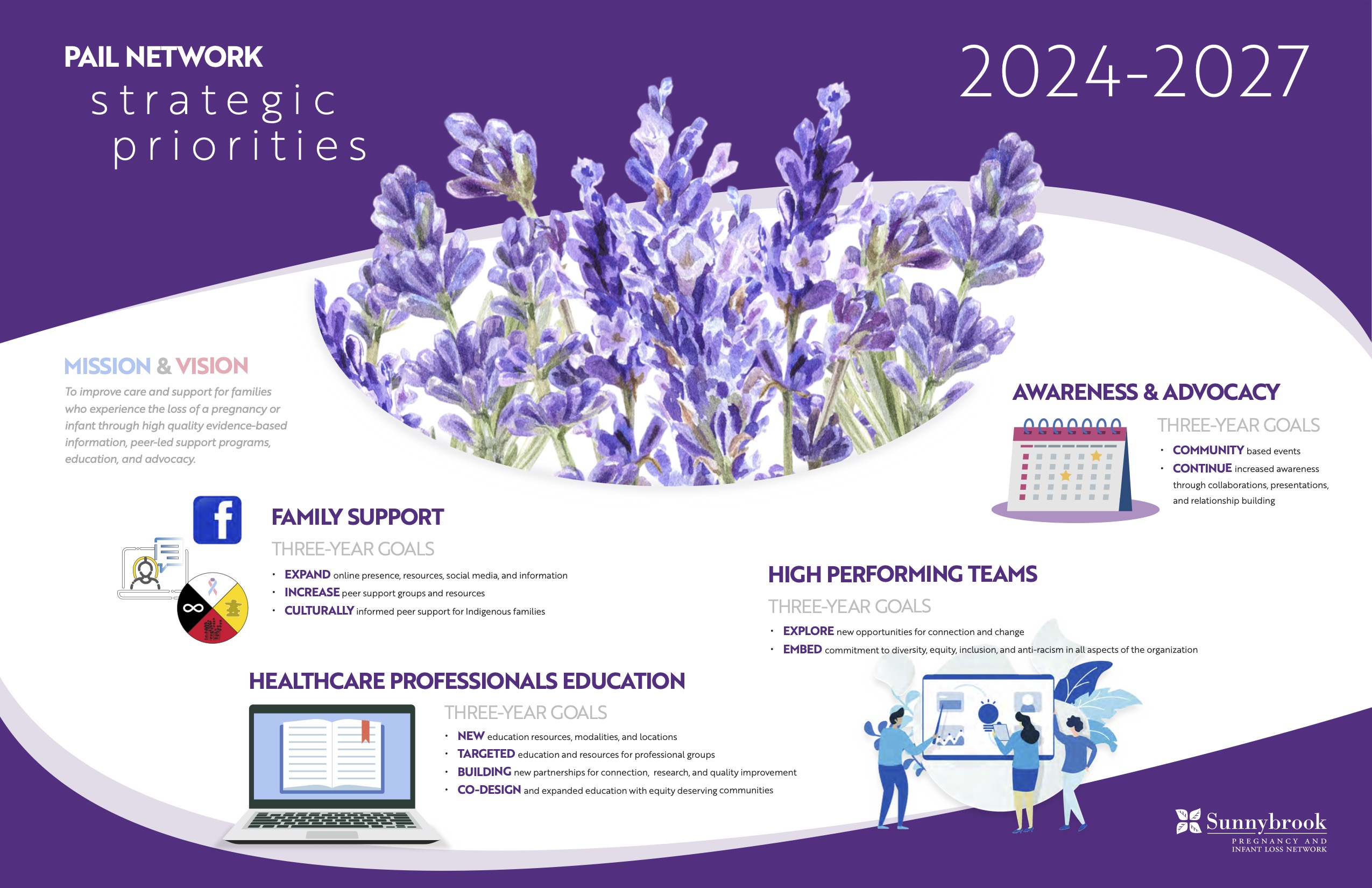 This plan sets out a clear path for PAIL Network as we continue to work towards a better care experience for families who experience pregnancy and infant loss in Ontario. It builds on our past progress and outlines clear priorities for action in four strategic directions: